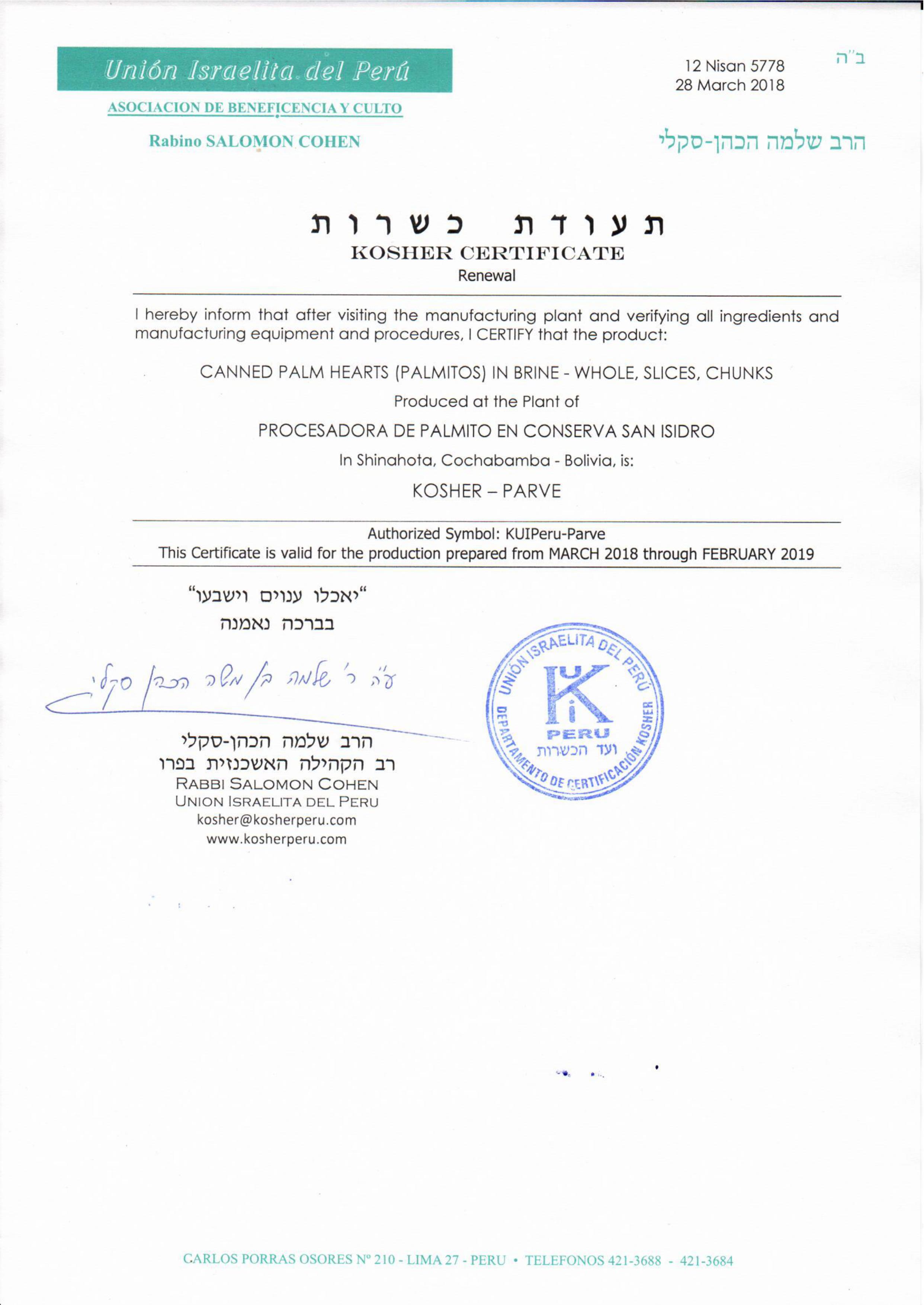 Factories have the infrastructure and equipment specially designed and with the implementation of Food Measures assurance and safety guarantees for the obtention of preserved food with a useful life of 4 years. Canned palm is a high- quality product with high culinary quality, delicious to taste and versatile, reasons why it is greatly appreciated and required in the major markets of the gourmet world. Because of its composition in protein and minerals, it is appropriate for people who hold a diet designed to improve the nutrition of their families or for the ones who are looking to start a healthy lifestyle. In addition to this, the heart of palm is a generous product in regards to having very few calories and high in fiber which is ideal for weight loss. Palm processed by Insumos Bolivia is an “environmentally friendly” agricultural product. It is also important to note that in the process of developing the palm, its organoleptic characteristics are not modified.